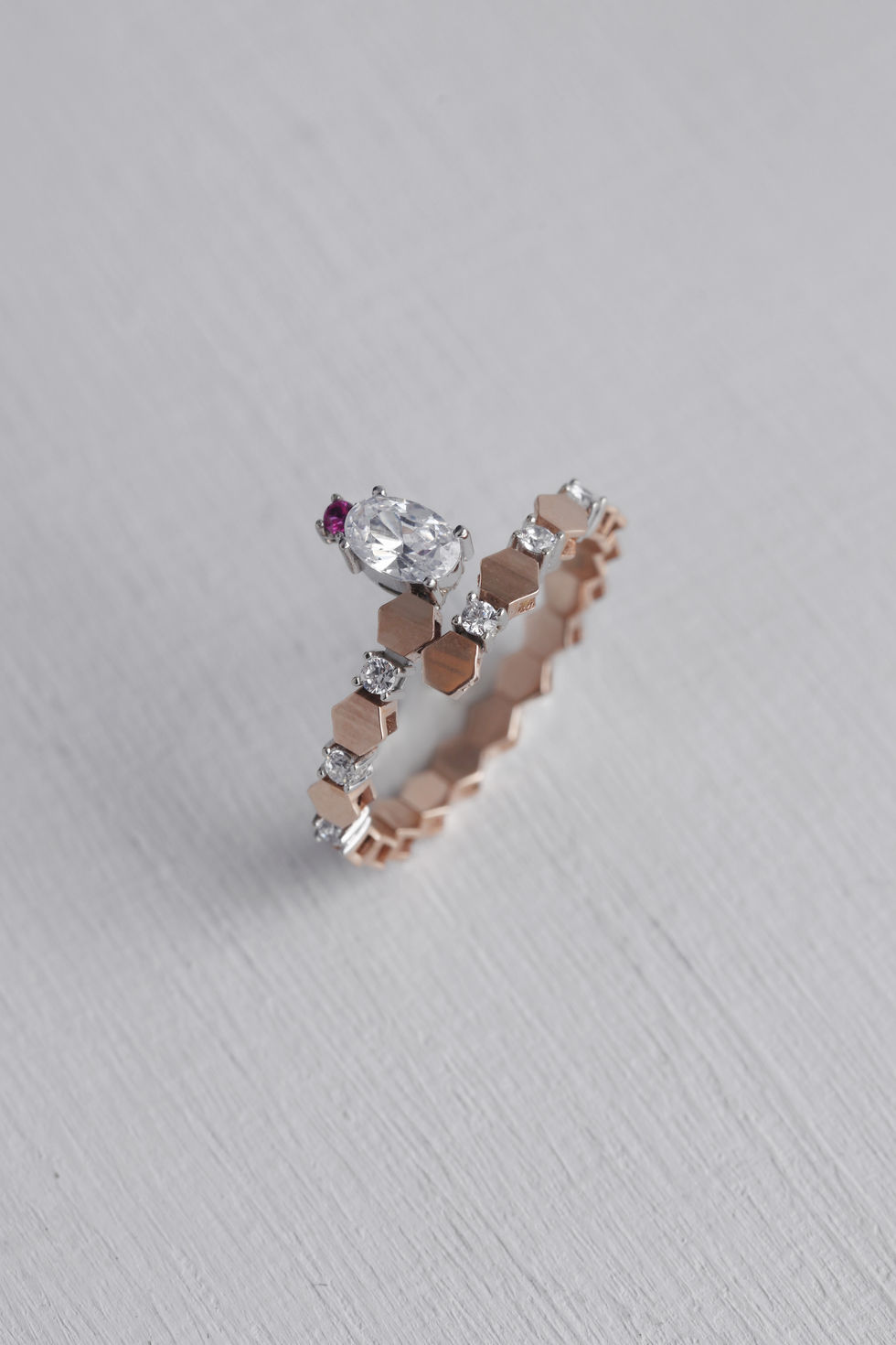 Modern çizgilerle tasarlanan Hexa Grace Yüzük, altıgen formdaki detaylarıyla dikkat çeker.